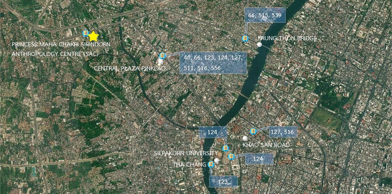 Public Bus Service: Buses stop in front of the venue include 40, 66, 123, 124 (fan only), 511, 515, 516, 539 (air-con), for those travelling from Bangkok Old City, 123, 124, 127, and 516. All buses mentioned in the map below are those stopping at the venue.